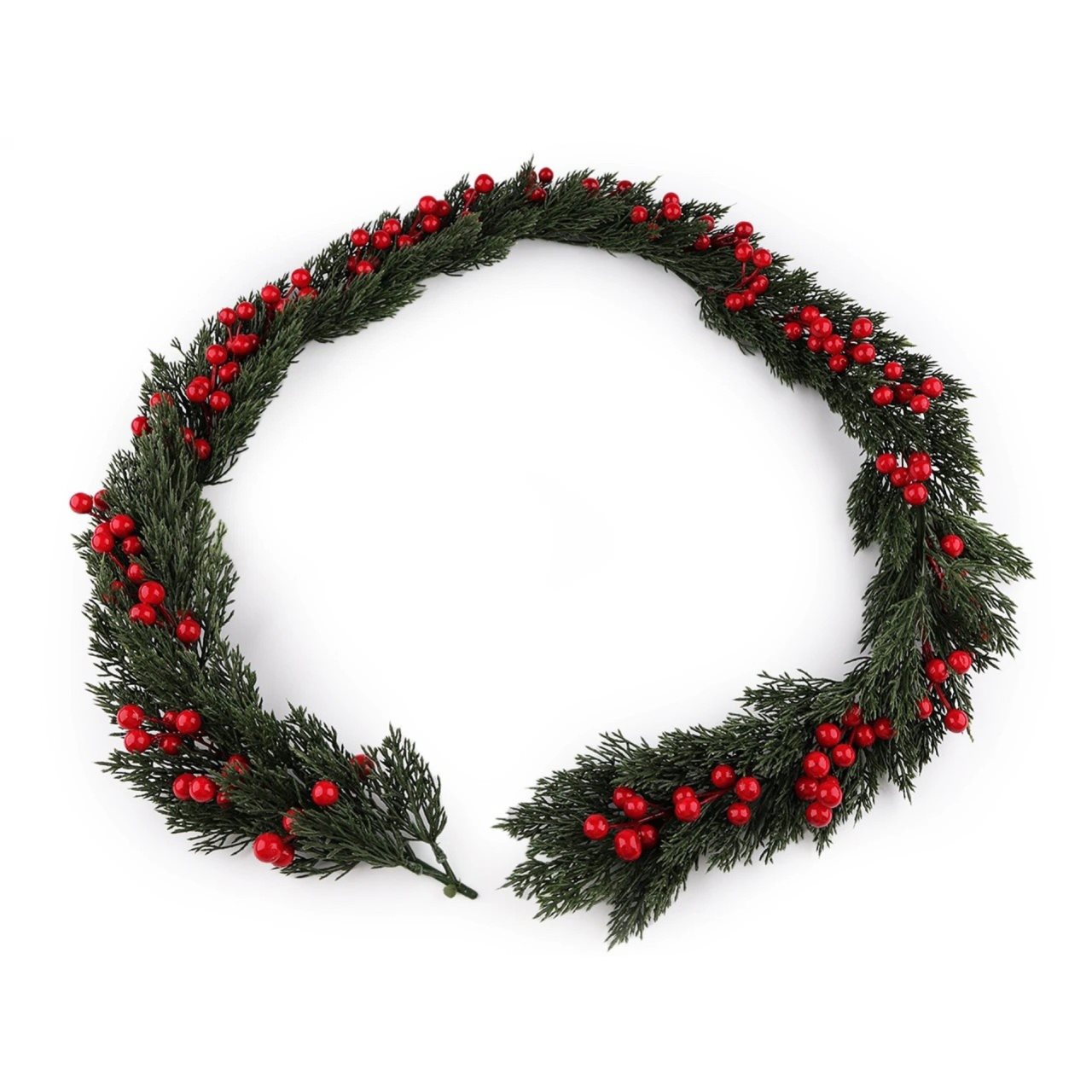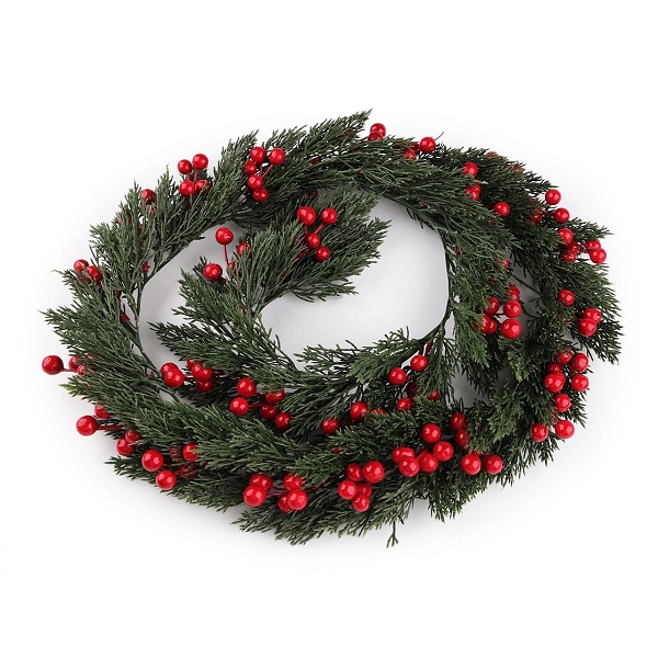 Umelý vianočný veniec je bohato zdobený červenými bobuľami.