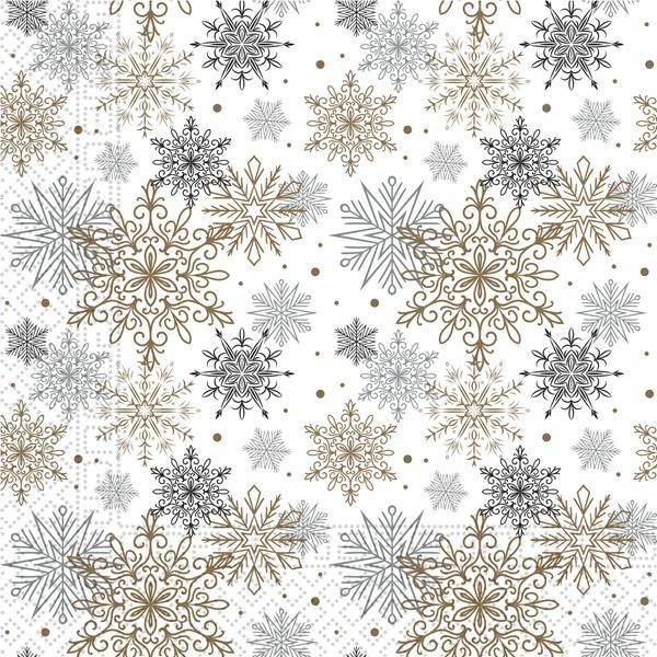 Slávnostné servítky s originálnym motívom snehových vločiek. 20ks kvalitných 3-vrstvových servítok v balení. Pevné servítky sú ideálne na slávnostné stolovanie, kde podčiarknu príjemnú sviatočnú atmosféru.