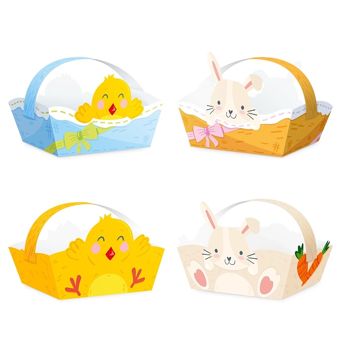 Veľkonočné papierové košíčky s kuriatkami a zajačikmi sú dokonalým doplnkom na ozdobenie sviatočného stola alebo na darovanie malých veľkonočných darčekov.