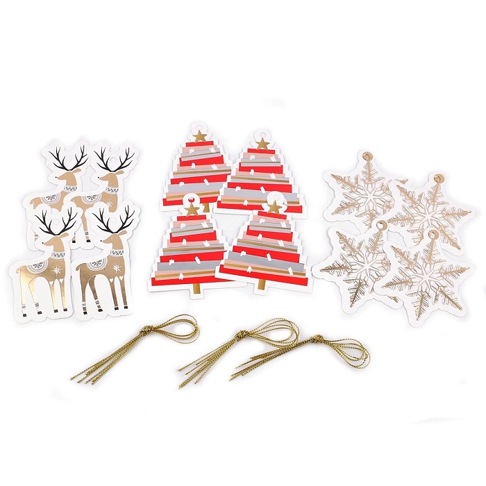 Papierové menovky s motívmi sobov, stromčekov a snehových vločiek sú vhodné na zdobenie zabalených darčekov, darčekových tašiek, fliaš na víno atď.