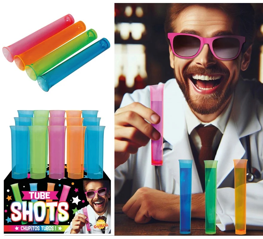 Pomocou tejto sady panákov, ktoré vyzerajú ako farebné skúmavky, môžete na svojich priateľoch robiť pokusy s ochutnávkou alkoholu.