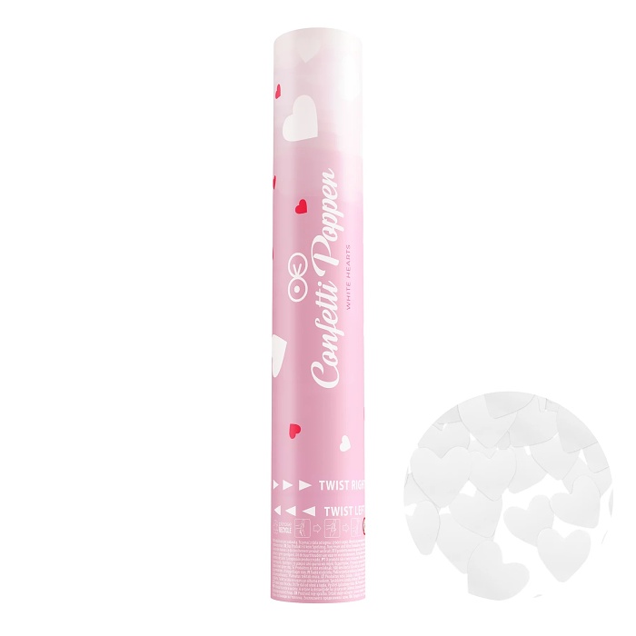 Prekvapte svojich hostí záplavou konfiet v podobe bielych srdiečok z jemného papiera, ktoré jednoduchým otočením trubice vystrelíte do vzduchu a padajú ako dážď na zem.