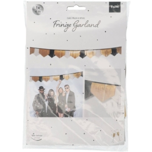 Táto strapcová girlanda v čiernej, zlatej a bielej farbe bude elegantným doplnkom výzdoby na vašu narodeninovú oslavu, oslavu výročia a iných slávnostných udalostí.