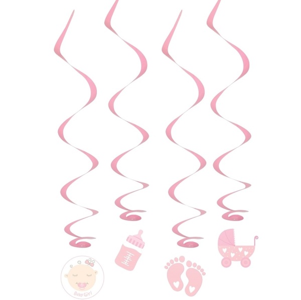 Špirálová papierová dekorácia Baby girl vo svetlo ružovej farbe, určená pre oslavu narodenia dievčatka,