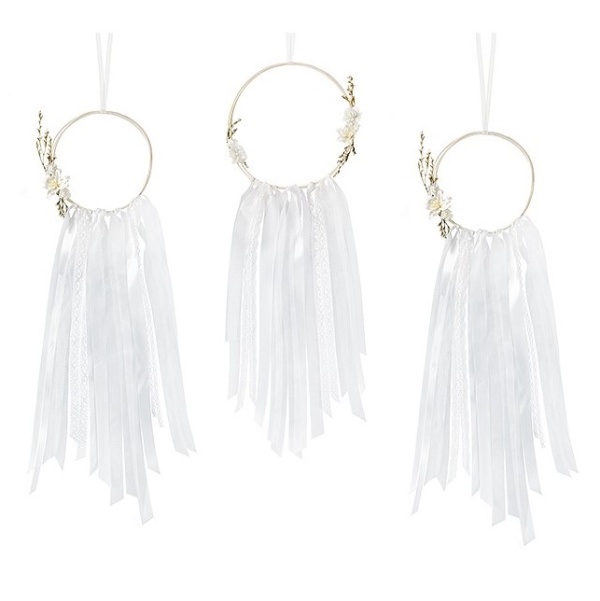 Balenie obsahuje 3 ks lapačov v podobe stúh a bielej čipky. Stuhy a čipky sú pripevnené na ratanovom bicykli s kvetinami.