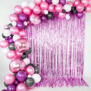 Záves na pozadí z lesklej fólie je tvorený tmavo ružovými fóliovými prúžkami