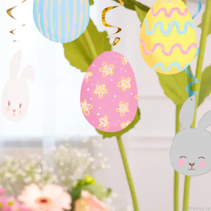 Dodajte svojim veľkonočným dekoráciám nádych kúzla pomocou týchto závesných špirál s vajíčkami a zajačikmi.