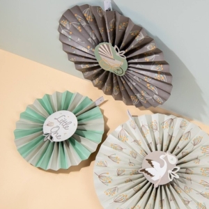V balení nájdete 3 ks závesných vejárov. Dva veľké majú priemer 35 cm so vzorom Blooming Baby: bielu s bocianom a šedú s kočíkom. Menšia má priemer 25 cm: mätovo zeleno-biela s textom "Little One".