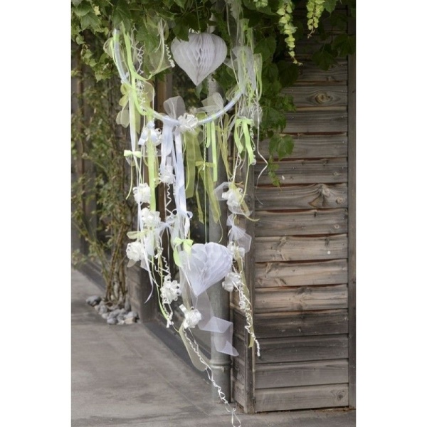 Sťahovacie kokardy sú tiež pekné ako závesná dekorácia spolu s inými svadobnými dekoráciami a doplnkami.