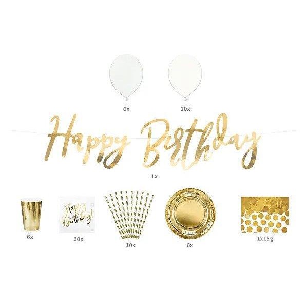 1x zlatú narodeninovú girlandu, 6x zlaté papierové poháre, 6x zlaté papierové taniere, 10x papierové slamky, 20x obrúsky "Všetko najlepšie", 15 g zlatých konfiet, 10x biele latexové balóniky a 6x číre latexové balóniky.